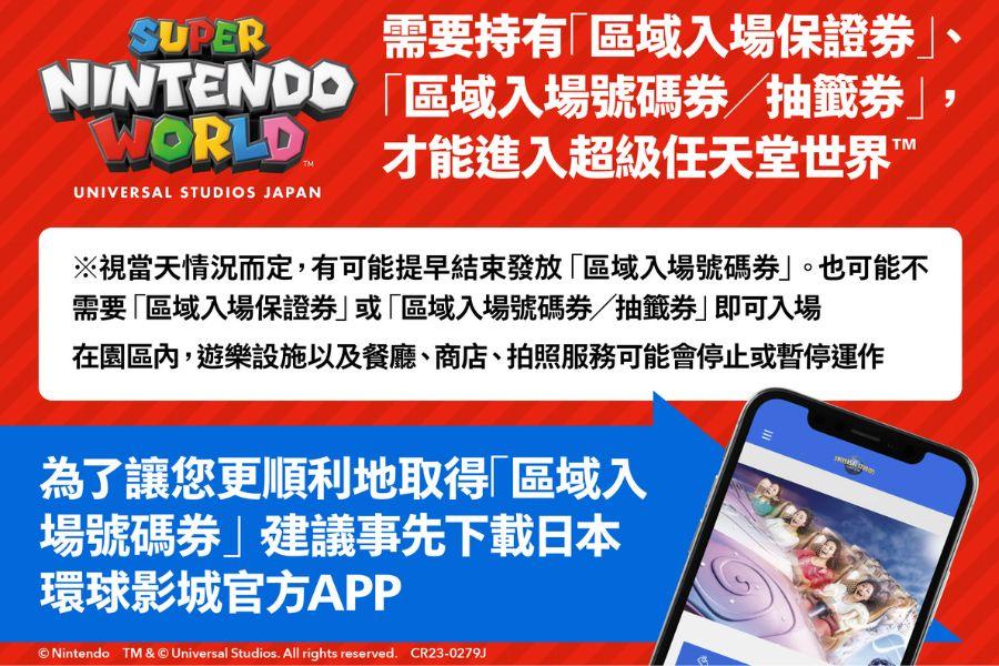 - 需要持有「區域入場保證券」、「區域入場號碼券/抽籤券」,才能進入超級任天堂世界™