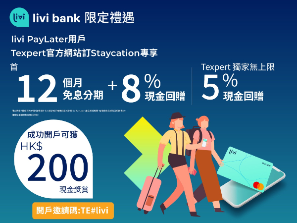 Texpert 專業旅運聯同 Livi Bank 推出超值獎賞計劃,大家可以 Livi PayLater Mastercard®️ 先買後付!由即日起至12月31日,開戶並輸入Texpert推薦code「TE#livi2022」,即可獲取額外HK$200現金賞。開戶程序簡易便利,最快一天便可完成批核,即開戶領取 Texpert 獨家優惠!