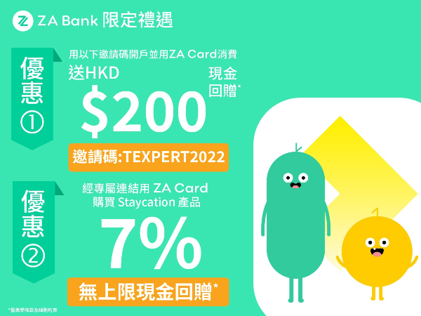 由即日起至12月31日使用專業旅運邀請碼「TEXPERT2022」開戶 ,成功開戶後再於14日內以 ZA Card 進行一次消費,即可獲得HK$200現金獎賞+百萬勁抽券。整個過程只需5分鐘,想申請 ZA Bank戶口,千萬不要錯過今次的獨家優惠!