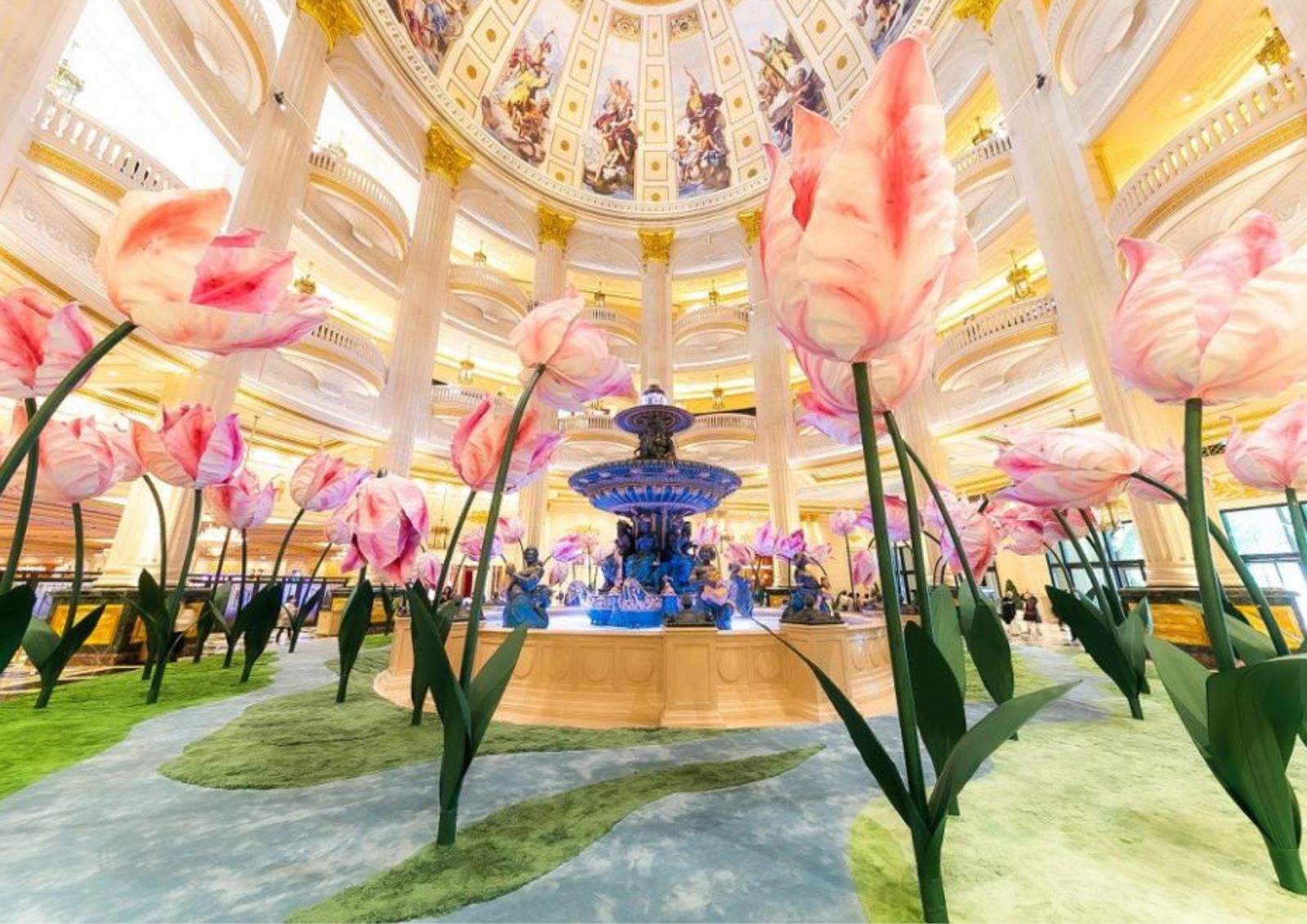 即日起至5月31日澳門巴黎人將以鬱金香為題,打造兩大巨型鬱金香藝術打卡點。大堂放置了 50朵高5米的巨型鬱金香,每朵均為人手上色,極具心思。而在巴黎人購物中心的3樓則有漂浮在空中的金色鬱金香,整個花道貫穿20米的香榭麗舍大街,到了黃昏時分鬱金香影像會投射於走道上。同時,在凡登廣場的天幕會上演約一分鐘的花漾燈光表演,天幕上的鬱金香慢慢變為金色,場面相當夢幻!