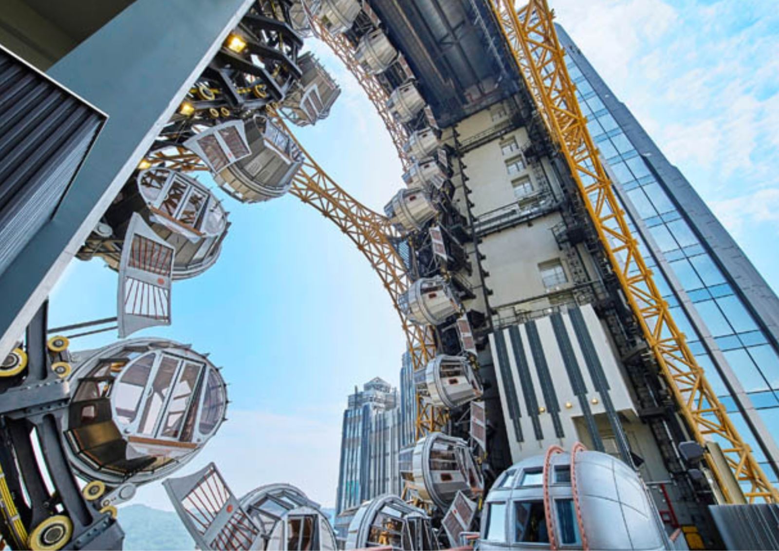 位於兩位大樓間的「8」字摩天輪設計概念是源於荷里活的電景影,高度達130米,其中有17個復古科幻為主題的包廂,每個大約可坐10人。包廂的內部是強化玻璃,踏在透明玻璃上,配合燈光及科幻的包廂設計,彷如置身於電影場景中。
